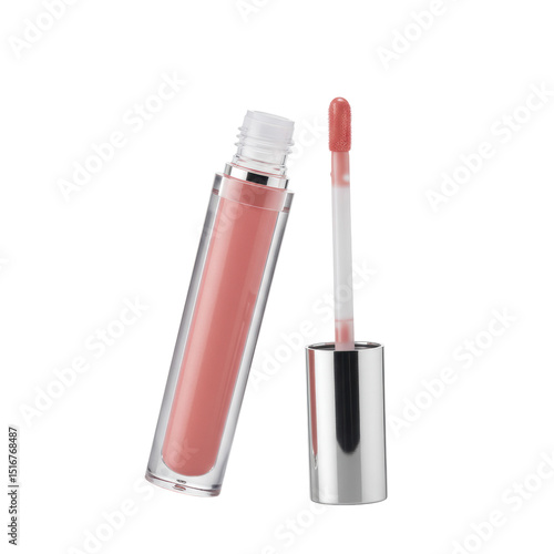Ultra realistic UHD photo of a lip gloss tube in 3/4 view with clear contours and boundaries, against a plain transparent background, lifelike accuracy, concept for beauty product advertising