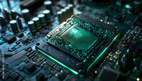 Ultra-detailed close-up chip on a sleek motherboard, glowing green circuits, futuristic design, soft ambient light, shallow depth of field, cinematic tech style