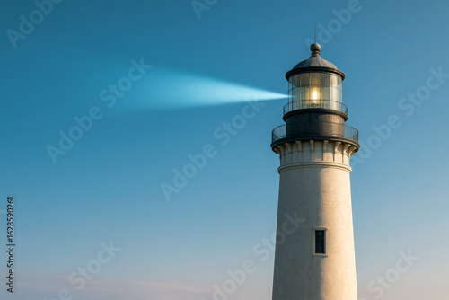 Ultra-realistic high-resolution image of a soft-toned lighthouse with a faint light-blue beam shining into a clear sky—symbolizing a quiet, flickering sadness persisting in an otherwise bright world