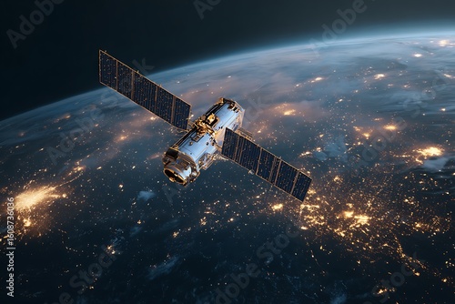 **Ultra-Realistic Satellite In Low Earth Orbit Capturing High-Resolution Data Streams, Earth Curvature Visible Below With Glowing City Lights At Night, Dramatic Lighting, Detailed Surface Textures --A