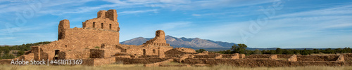 Ultrawide panorama of Abo church ruins at Salinas Pueblo Missions National Monument in New Mexico, with Manzano Mountains in background