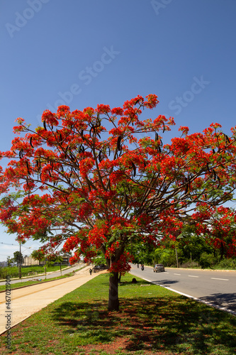 Uma árvore chamada flamboyant (Delonix regia), em flor, com o céu azul ao fundo.