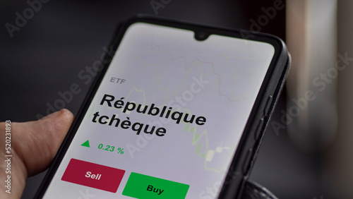 Un investisseur analyse un fonds etf république tchèque sur un graphique. Un téléphone affiche le cours de l'ETF. Texte en français francais République tchèque