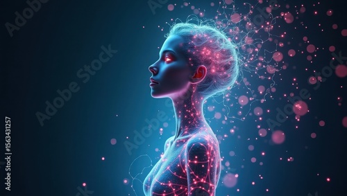 Una espiral de datos futurista, que recuerda a una aurora cibernética, envuelve a un agente de IA humanoide con un físico andrógino y esbelto