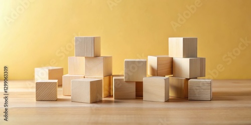 Unassembled Wooden Cubes Arranged on a Light Brown Surface Against a Pale Yellow Background