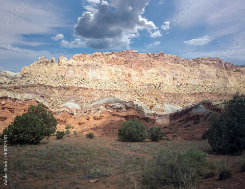 Unbelievable sandstone cliff and superlative domes with tumbleweeds on a hot summer partly cloudy day in Capitol Reef National Park in Southern Utah