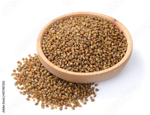 uncooked buckwheat in the wooden plate, isolated on the white background