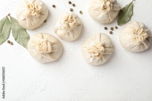 Uncooked khinkalis (dumplings) with peppercorns and bay leaves on white table, flat lay. Space for text