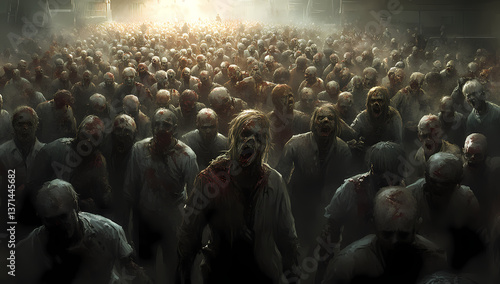 Undead Horde: A multitude of zombies emerges, a chaotic and ominous scene with figures advancing, creating an intense atmosphere.