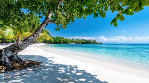 Under the soothing shade of a palm tree, this serene tropical beach with white sand invites relaxation and a sense of harmony with nature's beauty and tranquility.