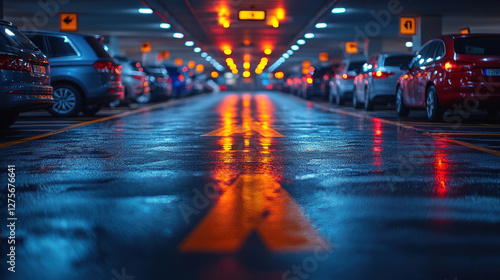 Underground parking lot with neatly arranged vehicles and vibrant exit signs