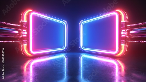 Underground tunnel with two glowing blank ad banners, vibrant neon lights, reflective metal surfaces, deep shadows, sci-fi atmosphere, futuristic design, high-definition