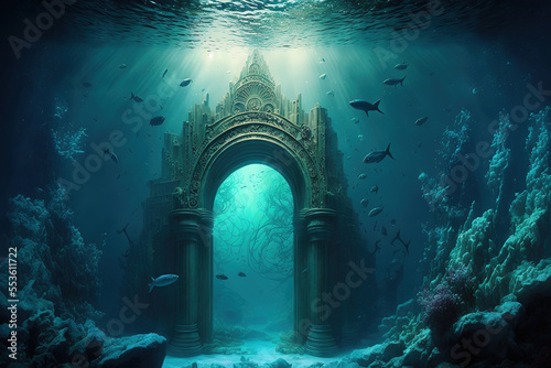 Underwater ancient city in the depths of the ocean. Atlantis lost world. ancient sunken architecture. Underwater gorges and tunnel. Lots of underwater organisms and fish. Underwater deep world. AI