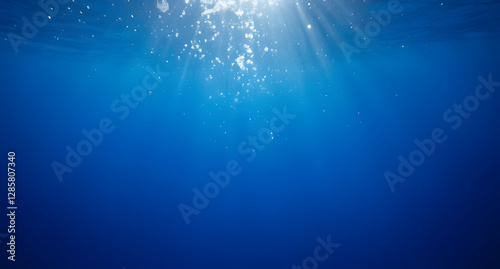 Underwater bubbles rising background. Soft light filtering through the deep blue ocean