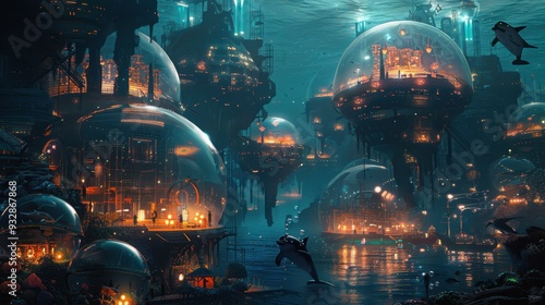 Underwater Cityscape with Illuminated Domes and Dolphins
