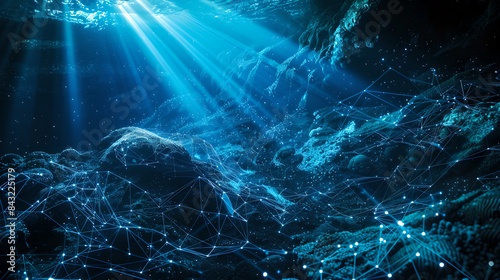 Underwater communication network visualized with light beams connecting subsea data stations in a bioluminescent ocean, connection, network, background, sea, digital, information