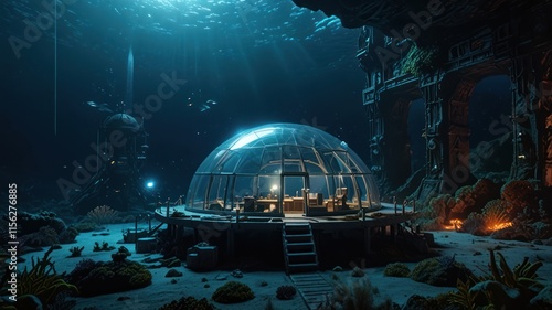 Underwater Dome Office Structure Near Ancient Ruins
