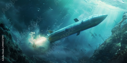 Underwater launch of a satellite mimicking a torpedo ππ. Sleek, covert, and futuristic with realistic underwater effects and dynamic motion.