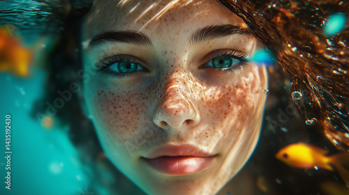 underwater portrait of a young girl surrounded by fish – perfect for fantasy art projects, storytelling visuals, or editorial design on nature and imagination