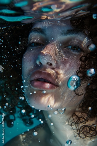 Underwater portraits of curly-haired women, underwater photography soft light and deep blue water create shadows. In fashion style fashion magazine cover editorial style with surrealistic style