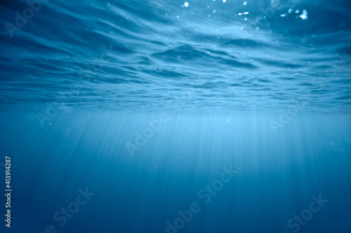 Underwater shot of sun rays penetrating the surface of the ocean.