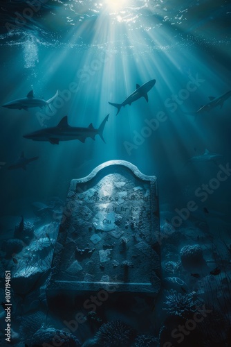 Underwater view of a sunken ship with sharks and rays of light