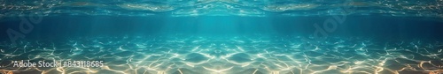 Underwater view of a sunlit ocean floor, with golden rays of sunlight creating intricate patterns on the sandy seabed. Banner, panorama