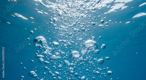 Underwater view of ascending air bubbles in crystal clear blue ocean water