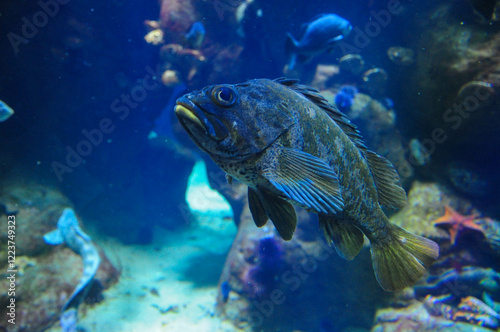 Underwater view of marine life with large fish swimming in aquarium setting