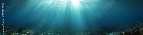Underwater view of the ocean floor with sunlight beams penetrating the water surface, creating a serene and ethereal ambiance. Aquatic landscape with a wide-angle perspective.