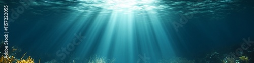 Underwater view of the ocean floor with sunlight beams penetrating the water surface, creating a serene and ethereal ambiance. Aquatic landscape with a wide-angle perspective.