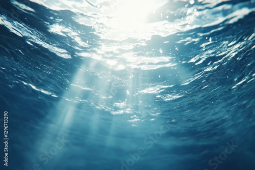 underwater view of the ocean floor, with sunlight filtering through clear water to create ripples on its surface