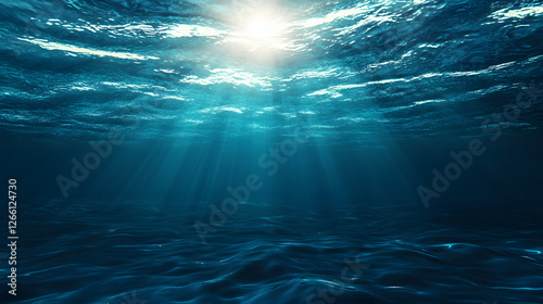 Underwater view of the ocean floor with sunlight filtering through, creating an abstract background for design use