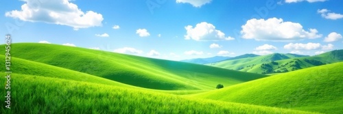 Undulating green hills bathed in sunlight, clear blue sky with scattered clouds, outdoor, scenic