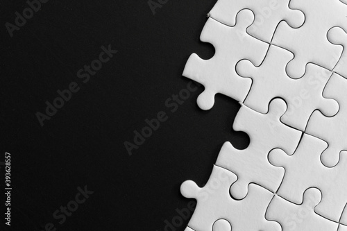 Unfinished white jigsaw puzzle pieces on black background with copy space