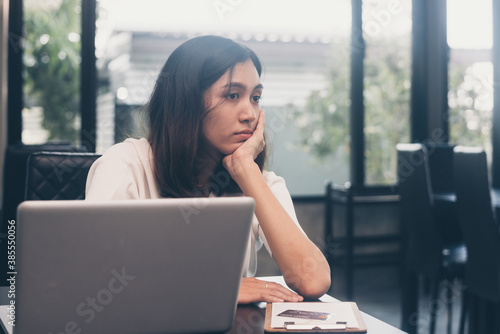 Unhappy Asian girlwith a laptop computer sitting in cafe, looking out of the window