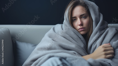 Unhealthy young woman struggle from chill freeze at home. No heating concept.