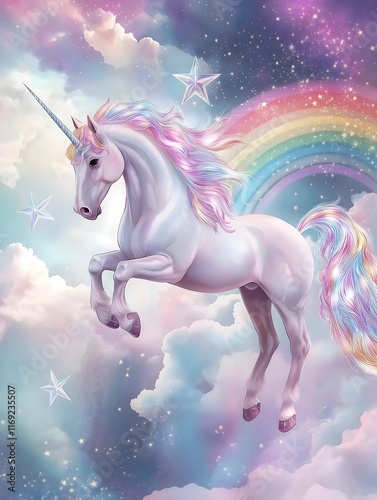 Unicorn-themed pattern with pastel clouds, stars, and rainbows