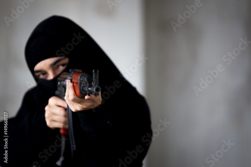 Unidentified man in black suit with mask is aiming assault rifle close up.