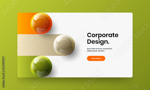 Unique brochure design vector layout. Colorful realistic spheres landing page illustration.