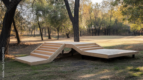 Unique wooden structure in a sunlit park offers playful outdoor activity. Pathway connects different levels, nestled among trees.