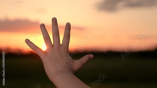 Unity of human nature. Child girl walk in nature sunrise. Happy girl kid stretches her hands to sun. Child palm in rays of sun at sunset. Sunlight through fingers of child. Kid dream at sunset in park