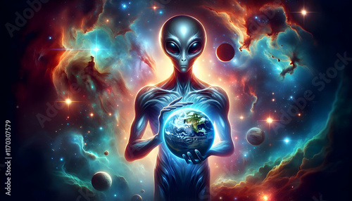 Universe An alien with a sleek design, holding Earth in both hands, with the cosmic background featuring swir2