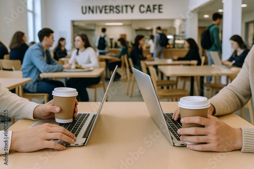 University cafe with students enjoying coffee and studying on laptops. concept of education, social interaction, college life