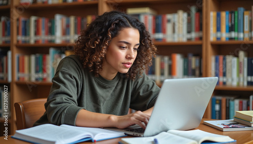 University student sitting in a library solving a math problem on a laptop, surrounded by books and notes, with a focused and determined expression