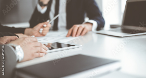 Unknown businessmen and woman sitting, working and discussing questions at meeting in modern office, close-up
