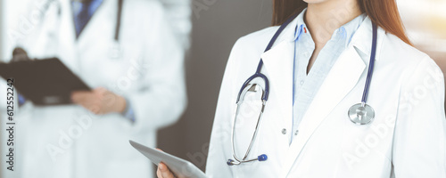 Unknown woman doctor iusing tablet computer in her hands, while standing in sunny clinic. Medicine concept during Coronavirus pandemic. Covid-2019.