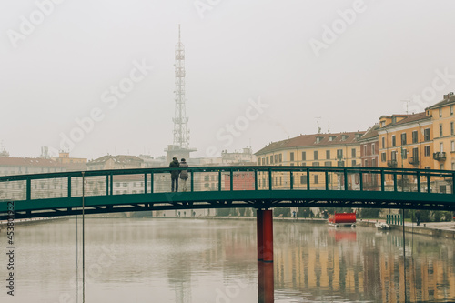 Unrecognisable couple standing on Alexander Langer bridge, Darsena waterfront on foggy winter morning, Milano city, Navigli district. Tourism destination concept