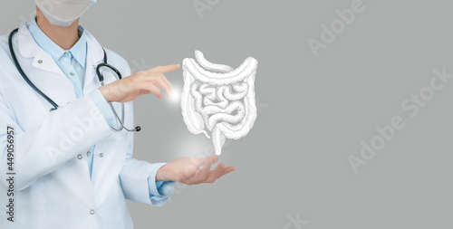 Unrecognizable doctor holding highlighted handrawn Intestine in hands. Medical illustration, template, science mockup.