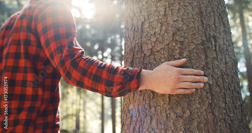Unrecognizable portrait of young man walking in a forest. Close up of a male hand touching tree in the woods.